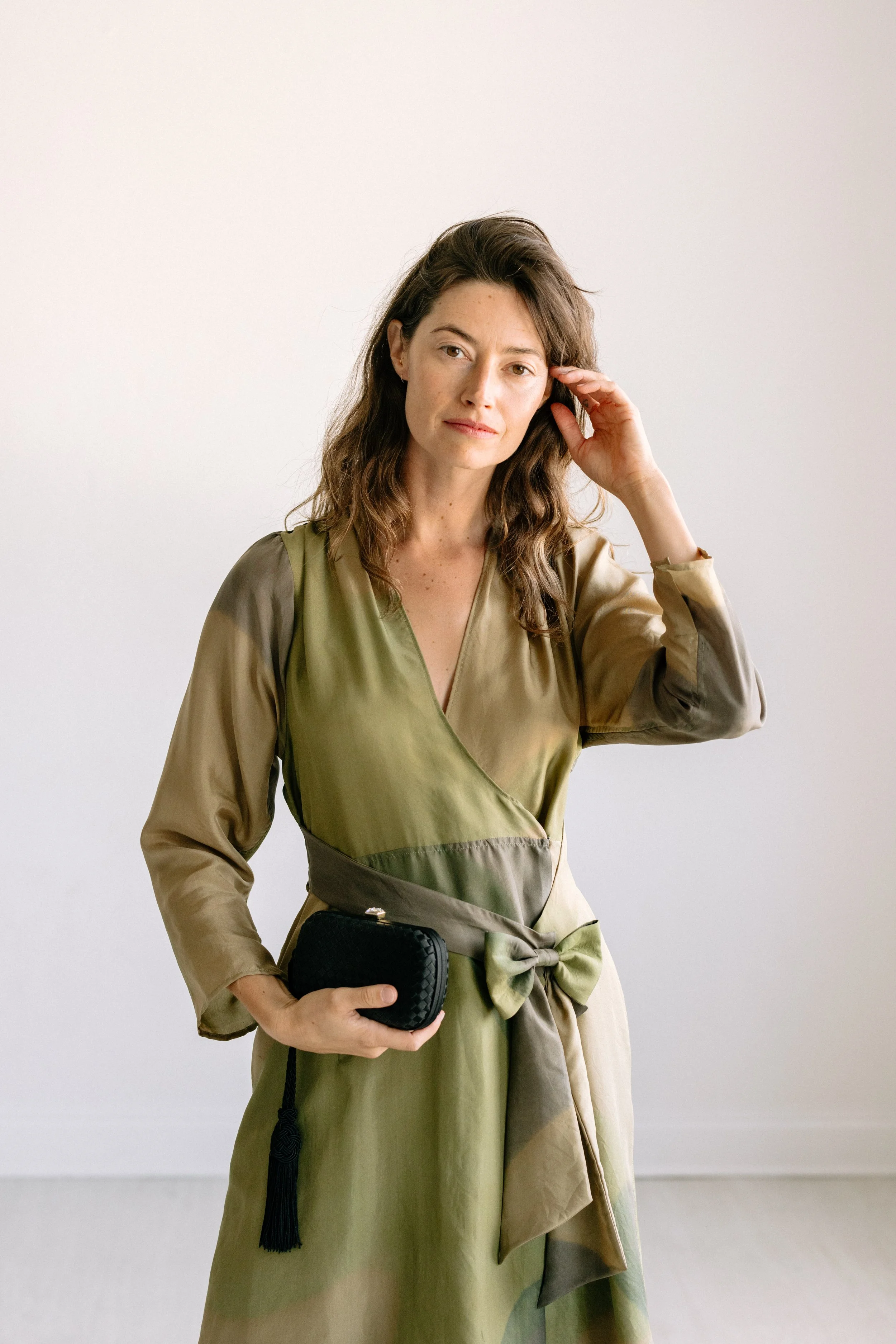 Camoflouge-esque printed Japanese silk wrap dress fastened with a bow for a feminine look that accentuates curves.